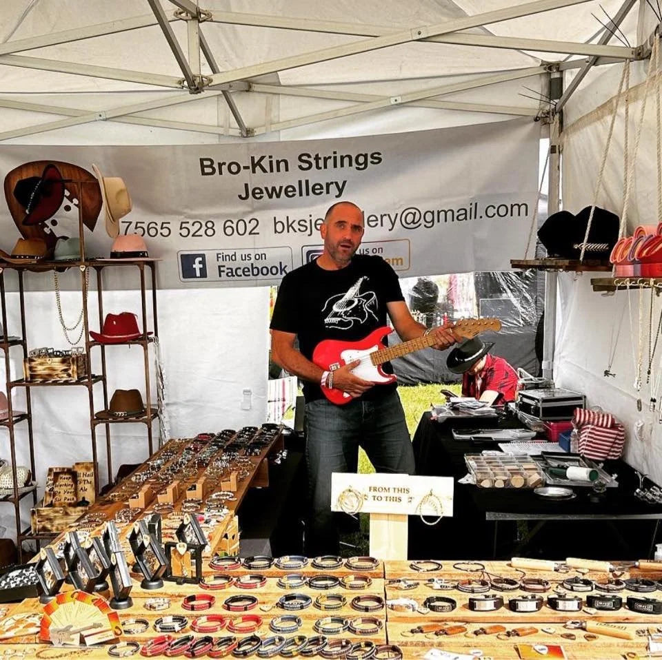 Bro-Kin Strings is a handcrafted brand built from reclaimed guitar strings, leather, and wood — turning the stories of played music into wearable pieces and meaningful gifts. Every item is made by hand, one at a time, blending rugged materials with musical heritage. From jewellery worn by one to pieces heard by thousands, each creation carries a past, a process, and a bit of soul.