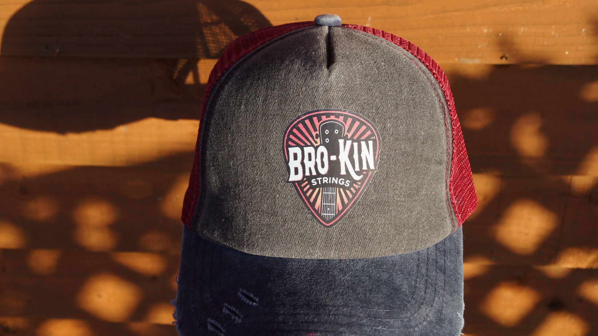 The Bro-Kin Strings trucker cap features a structured front, breathable mesh back, and bold logo design — made for gigs, festivals, and everyday wear.
