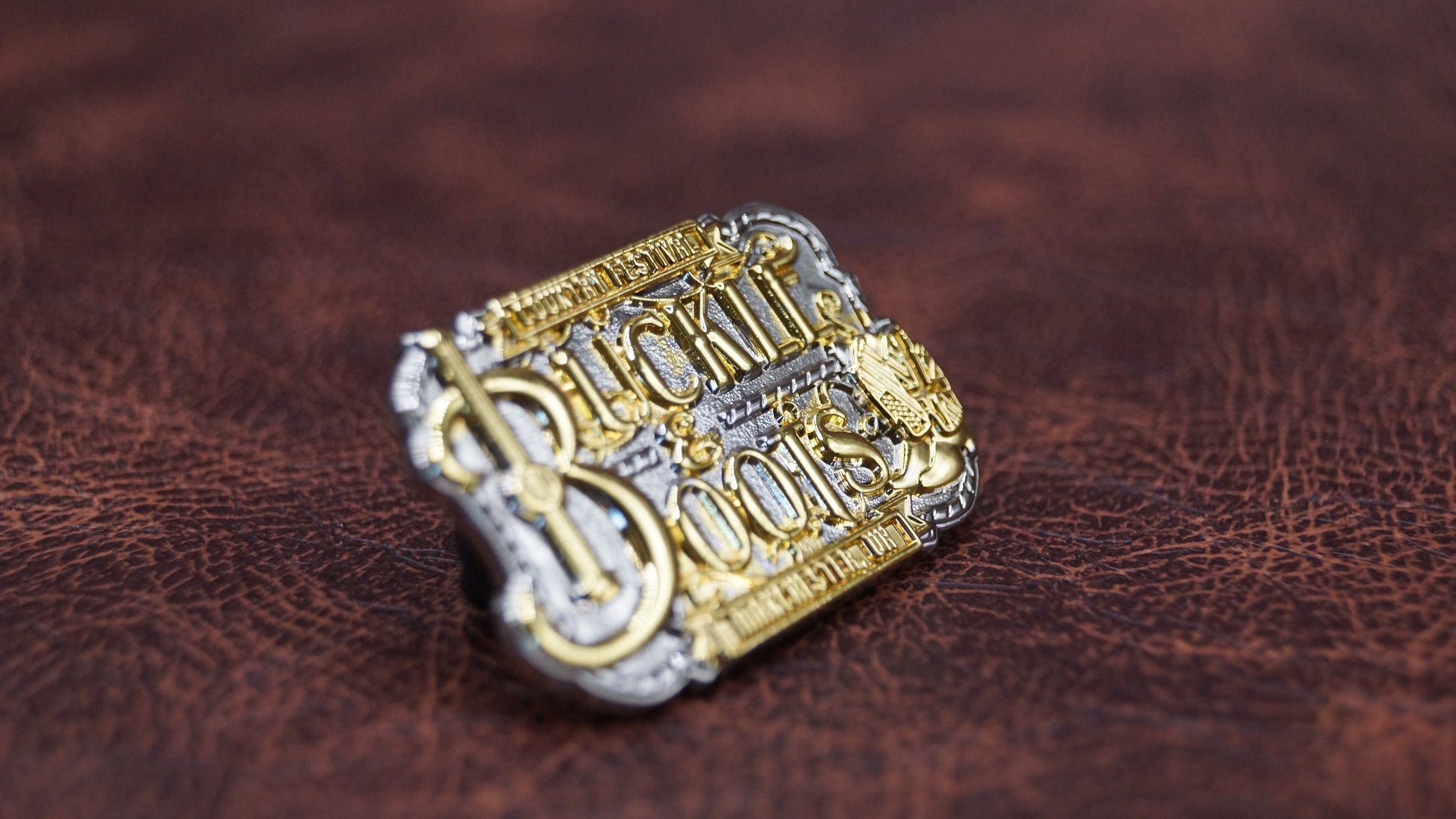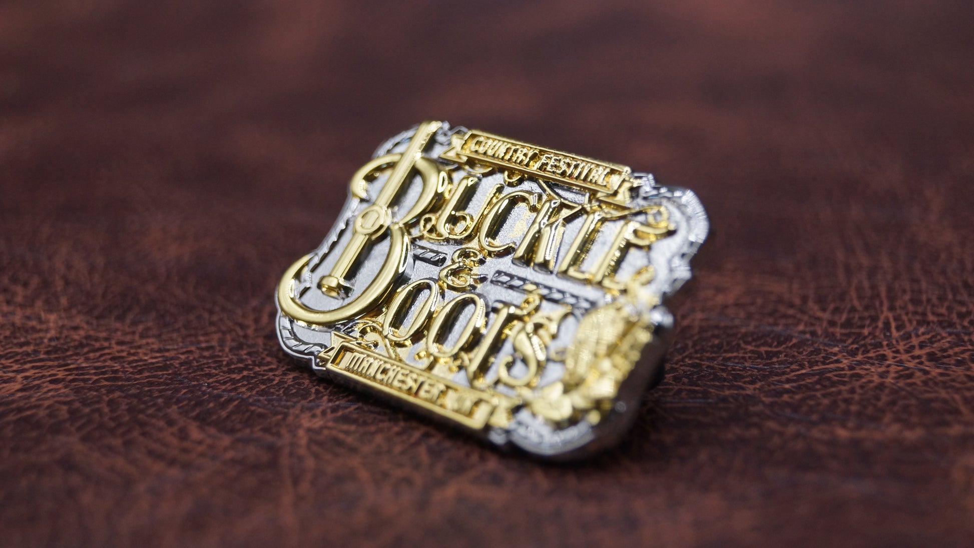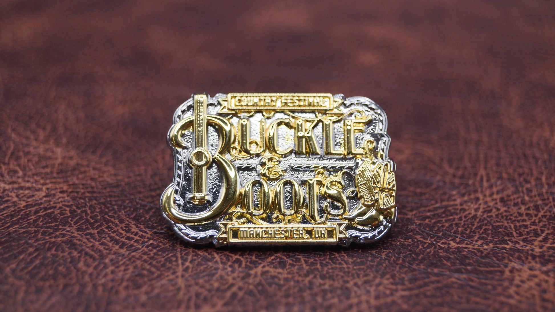 Finished in gold for a standout look, this Buckle & Boots Festival pin badge celebrates country music, community, and the Manchester festival scene.