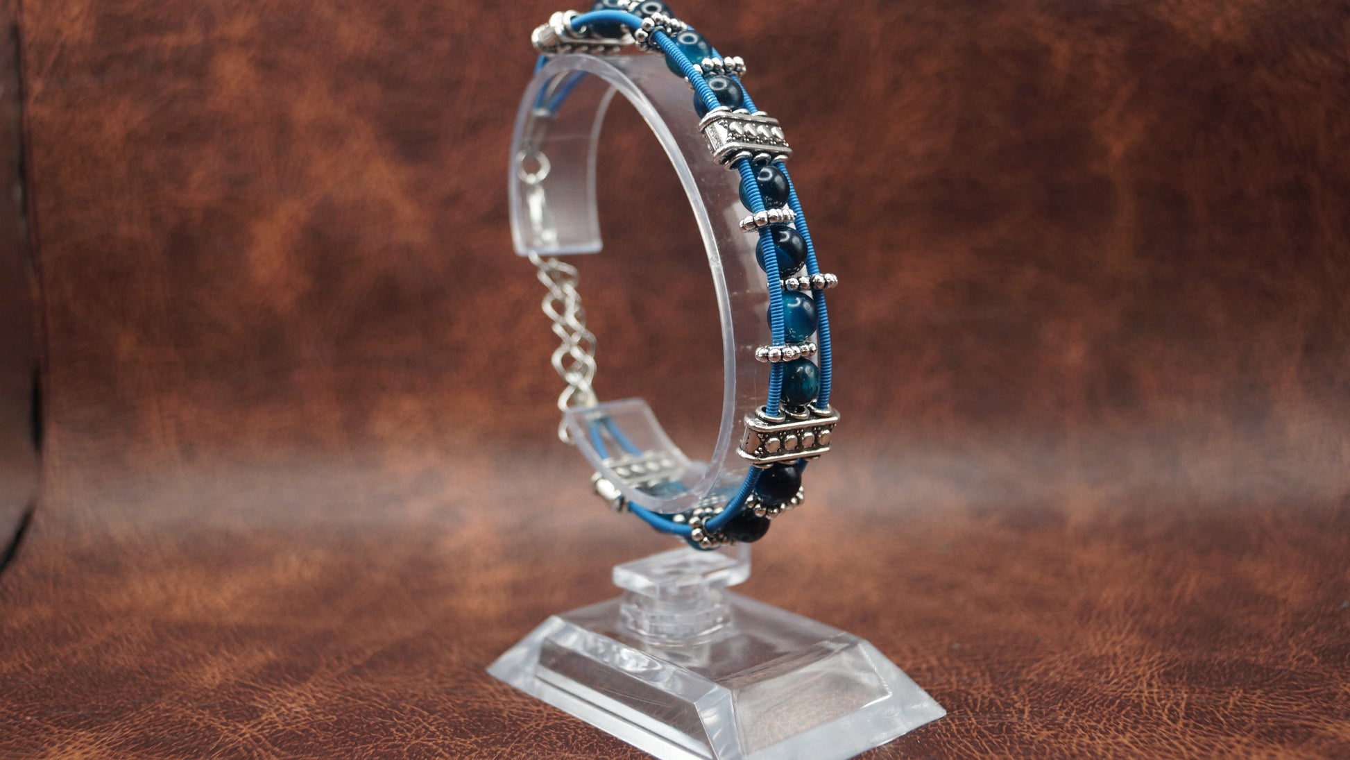 Featuring Cobalt beads, silver accents, and strinking blue strings, this piece speaks out and really shines in natural light, finished with an adjustable clasp for a comfortable, secure fit.