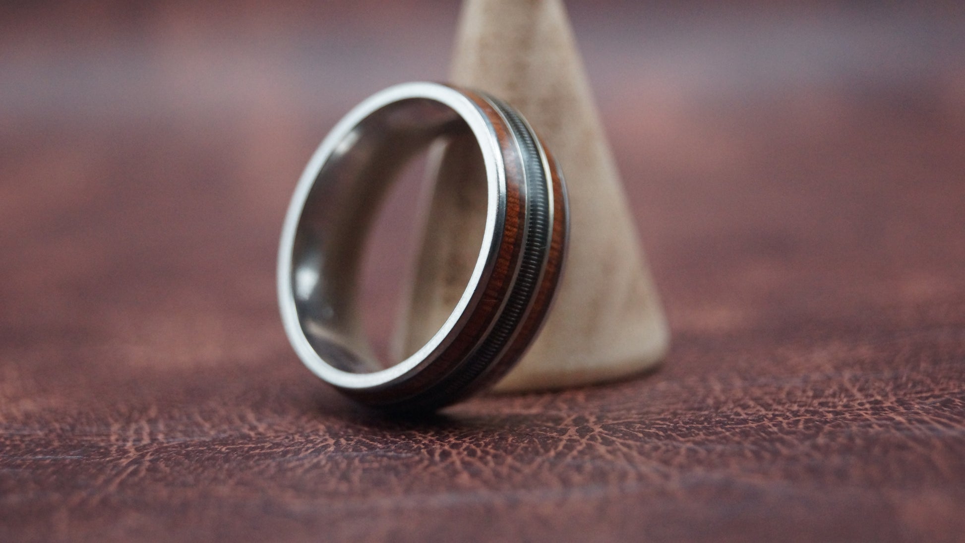 This Silver-toned metal ring features a rich rosewood-style outer inlay, finished with a golden guitar string running cleanly around the band — subtle, distinctive, and full of character.